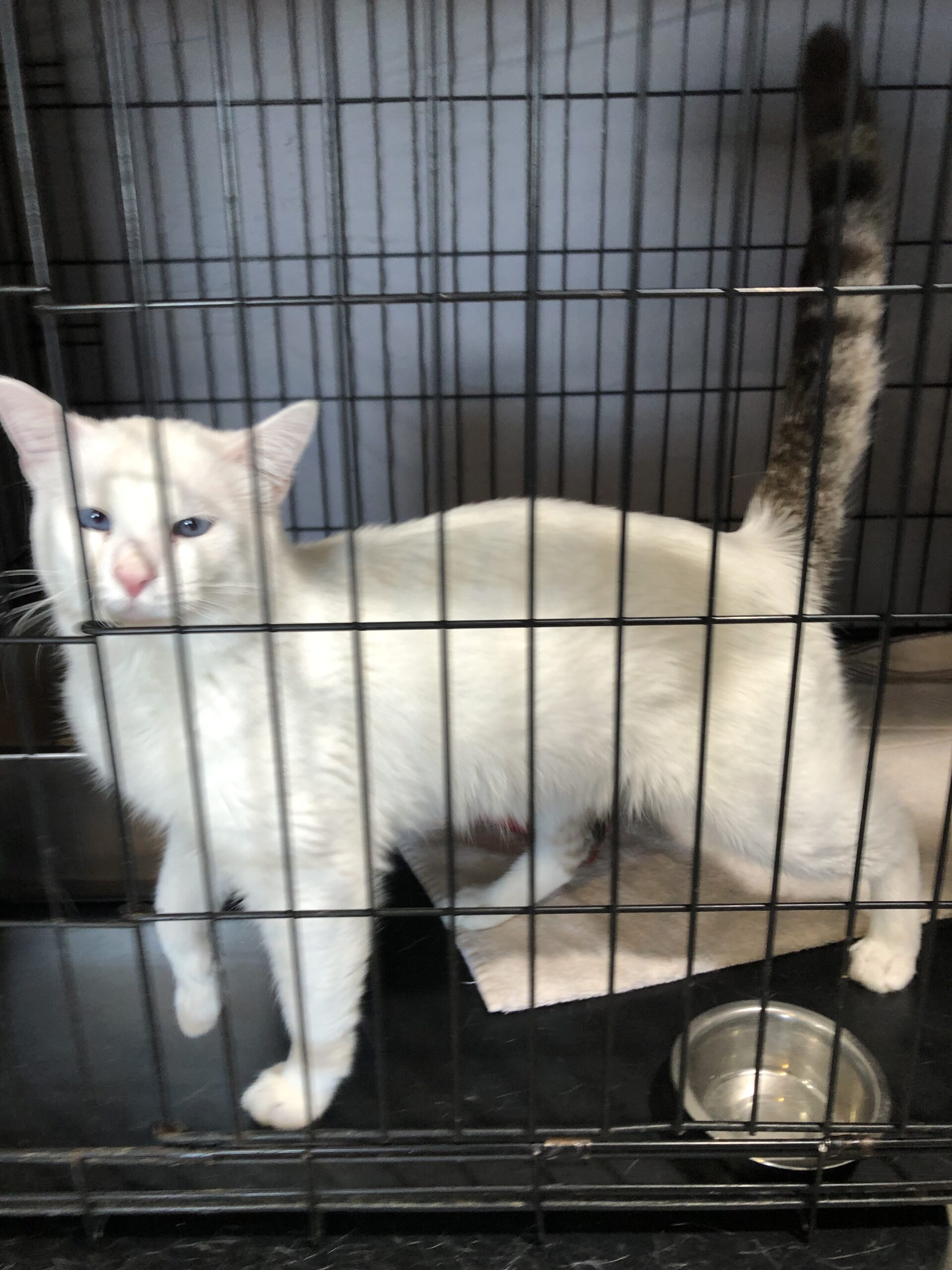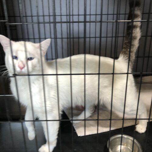 Alaska is all white with a tiger-striped tail. He is a very nice cat who loves to receive attention from people. This handsome boy is loaded with energy and has lots of love to give.