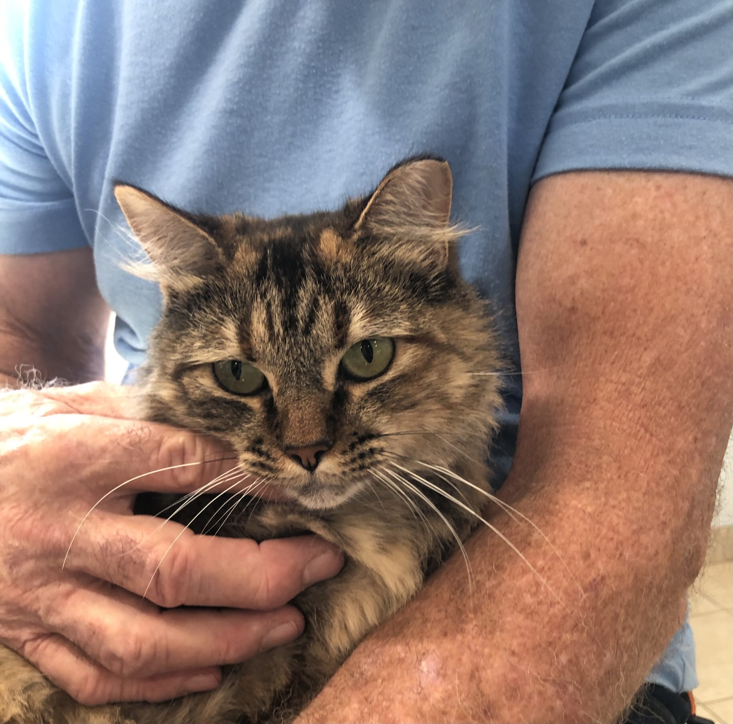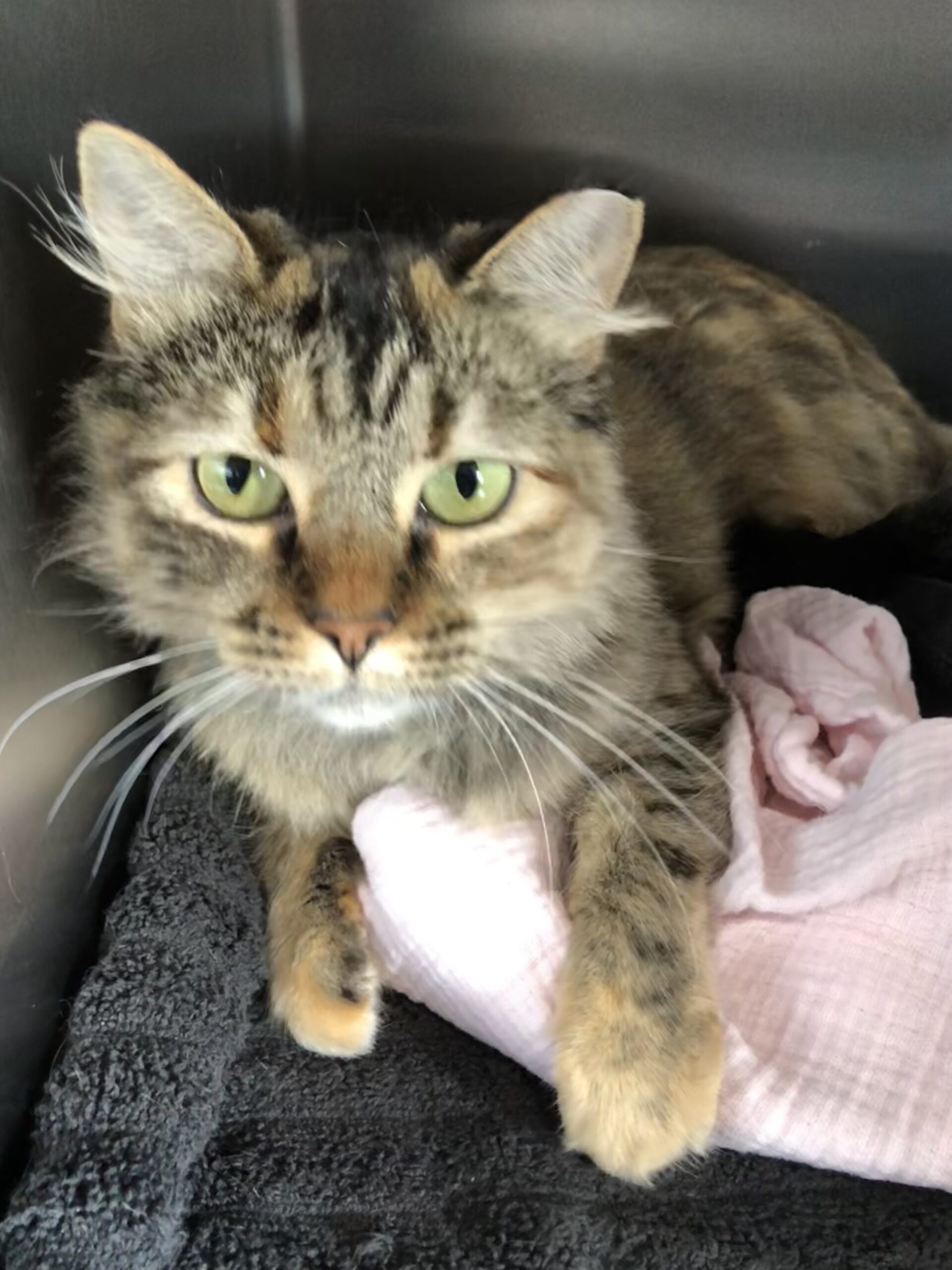 Bobbi is a beautiful torbie, which is a combination of a brown tabby and tortoiseshell. She is a sweet and affectionate girl who loves being on laps. Bobbi was initially thought to be feral, but after being brought to Kitty City and going to the vet for spay surgery, she has proven to all of us that she was just frightened at first and reacted accordingly and that she is actually a gentle and lovable kitty.