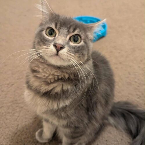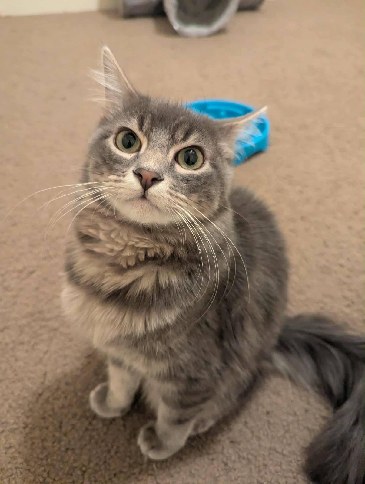 Cayenne is the quiet one with a grumpy charm! With his signature resting grump face and quiet presence, Cayenne might seem a little serious - but give him time and you'll discover a gentle soul who has a soft spot for food. He prefers to play solo from his siblings and is learning to build confidence around others. While he may not be the first to ask for attention, Cayenne is steadily learning to trust. If you're patient and appreciate a kitten with quirks and expressive eyebrows, Cayenne might be your guy!