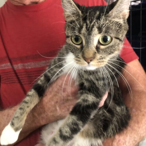 Mambo is a very pretty cat. She is a gray tabby with white markings that resemble a tuxedo pattern. Mambo is a friendly and sweet kitty.