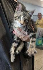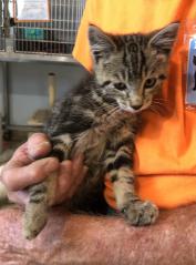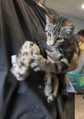 This cute little guy was rescued by a good samaritan, who pulled Oliver out of a car engine. His front right paw was injured. He was taken to our vet who said it is nerve damage in his leg. There is no way to know if he will get any feeling back in it or not. This does not slow him down whatsoever. We are giving this boy lots of attention and love, and he is eating it up. Oliver can best be described as a pistol! He is super playful and energetic. When being held, he reaches (or climbs) up to our face and gives love kisses and nibbles. He is all sugar and spice - and everything nice!