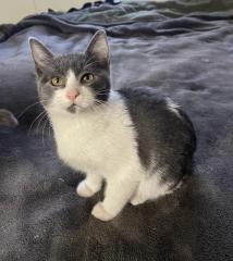 Pepper is a lovely gray and white female kitten. She's got a cute split gray and white chin.