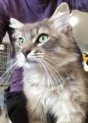 Silver Bullet is a handsome long haired brown tabby with white highlighted green eyes and a white mouth. This sweet boy has long ear hair and could be a descendent of a Maine Coon. Silver Bullet is friendly and gentle and enjoys human attention and being petted.