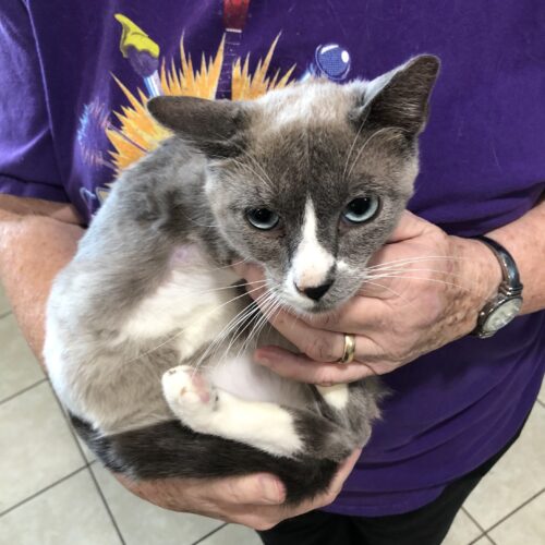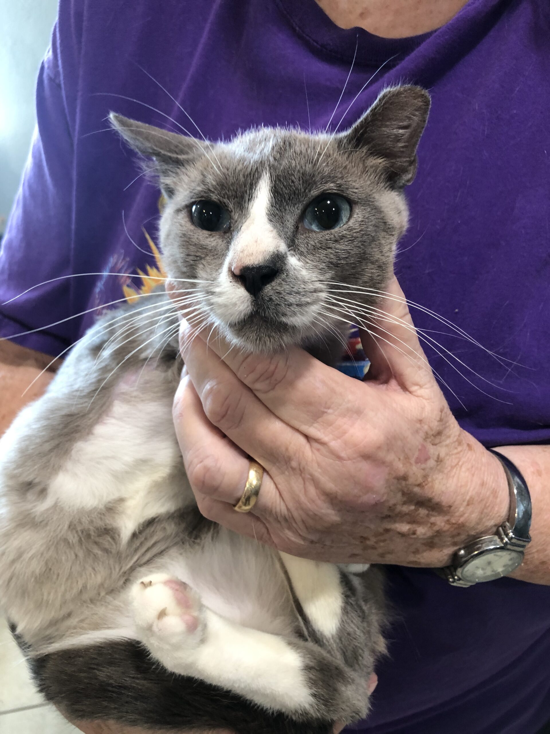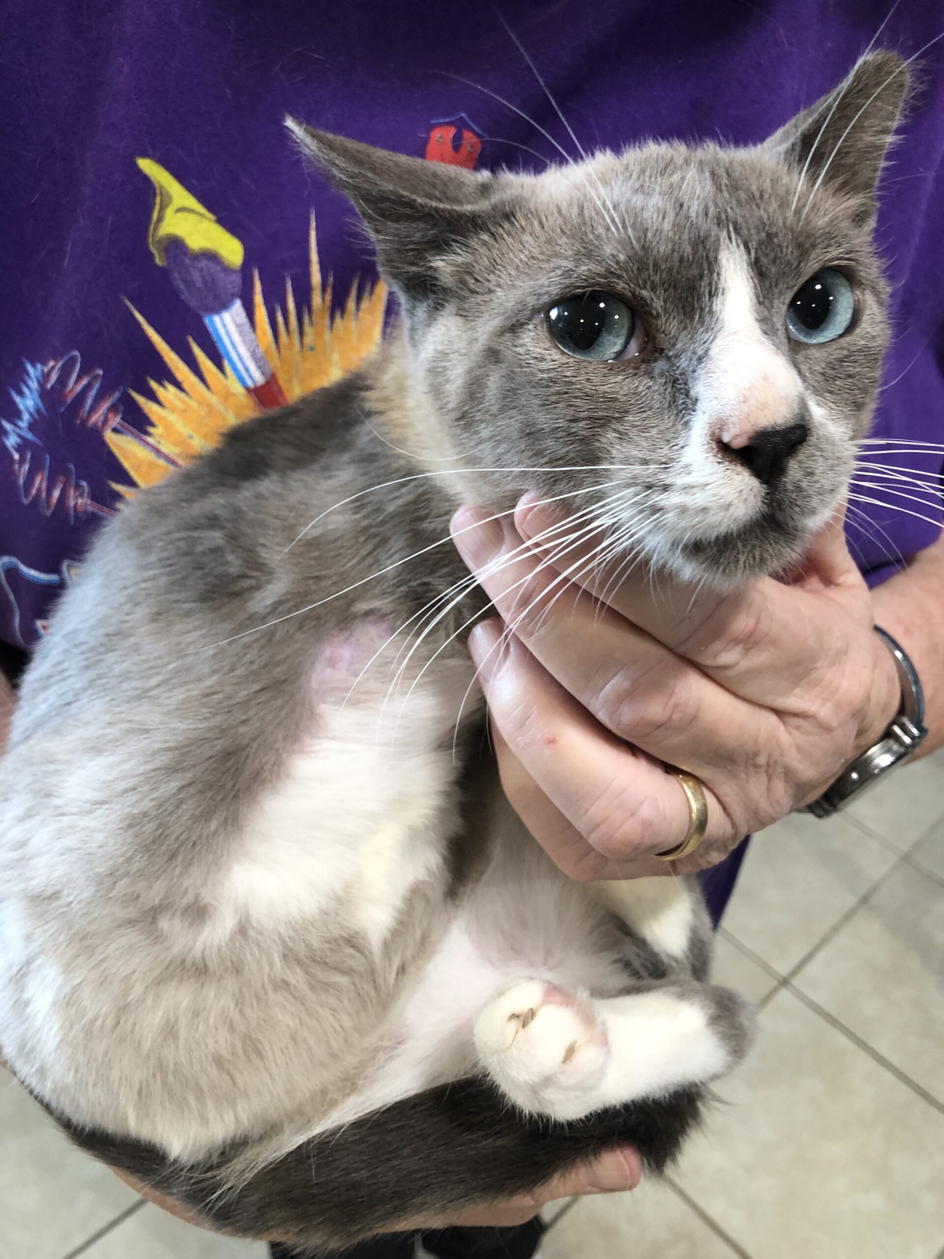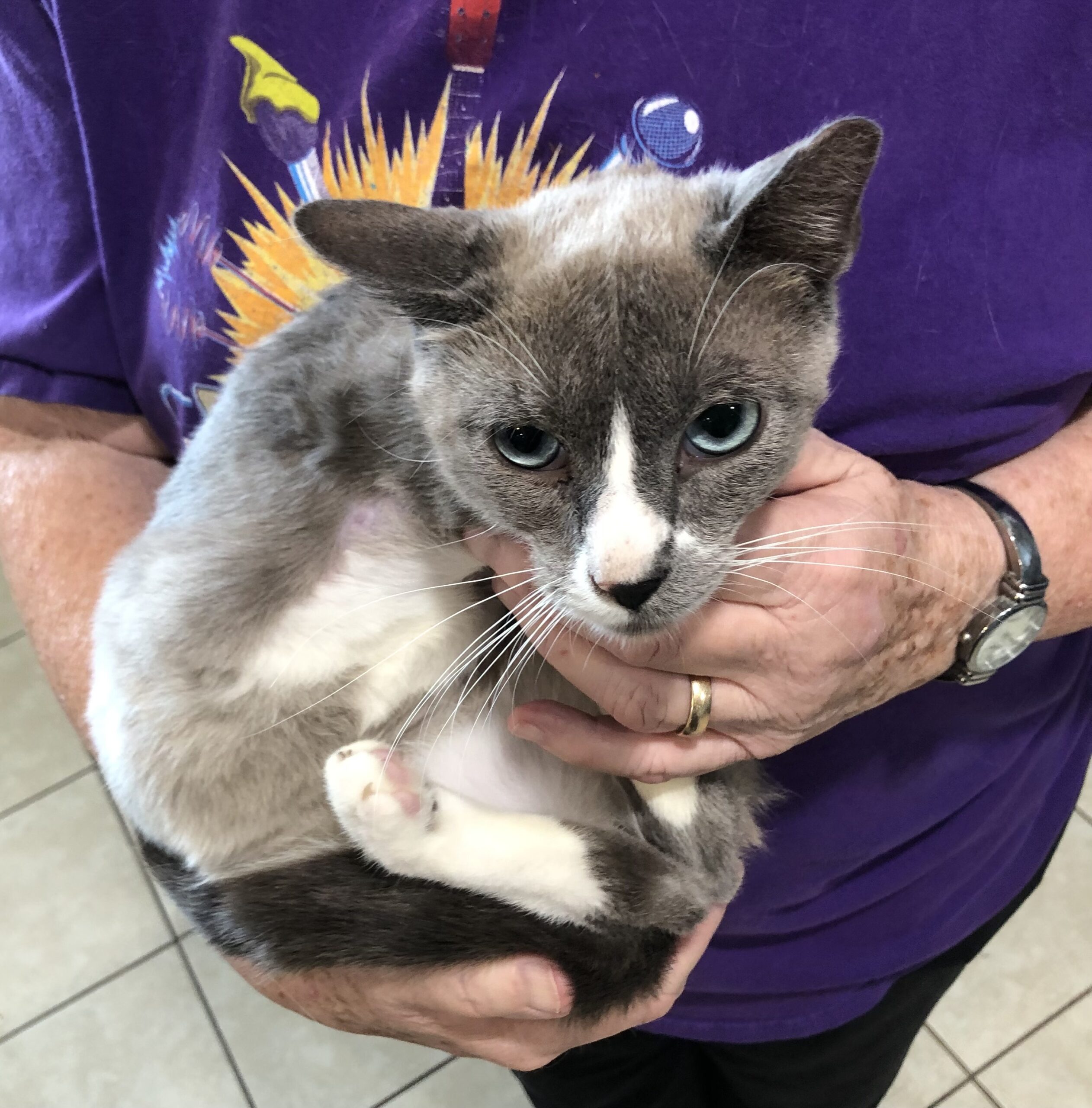 Our sweet little Sinbad was brought to Kitty City with a bad leg injury. The veterinarian could not save his leg and had to amputate it. This occurred on July 14, 2025. Sinbad has healed nicely and his shaved fur is growing back in. He has adapted to the physical and emotional change at a steady pace. He has a good appetite and loves treats. And he is super cute!