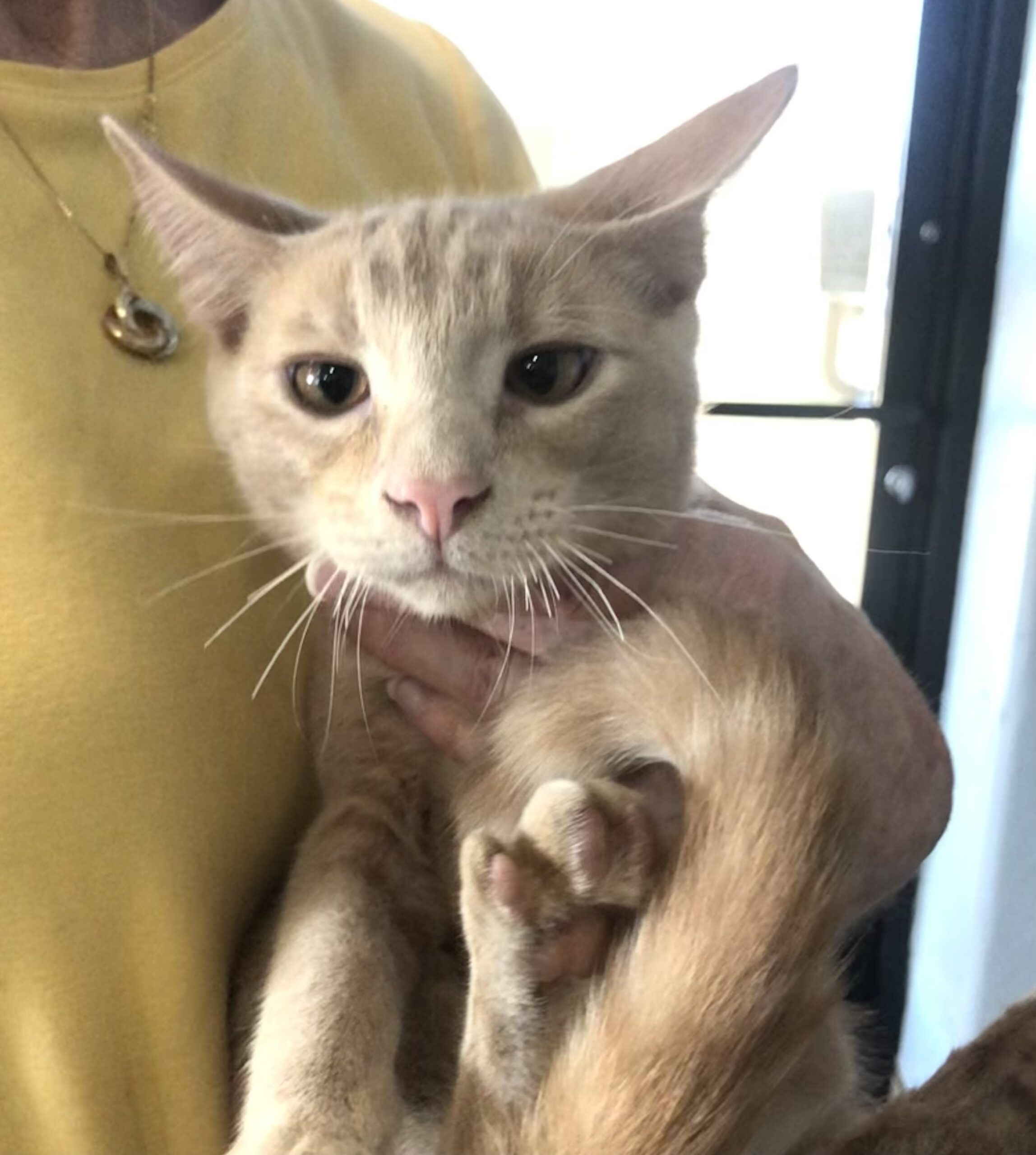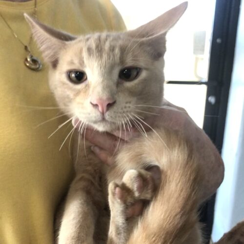 Slinky is a little bit more cautious than his brother Chill and sister Tink. But he will outgrow that bit of uncertainty the more he is handled, picked up and shown love. Slinky slinks along on the floor cautiously; we thought the name was fitting for him. When he does let us catch him and pick him up, the contentment he experiences from being petted overpowers his cautious side. He's getting there. Slinky is as sweet and pretty as his sister and brother.