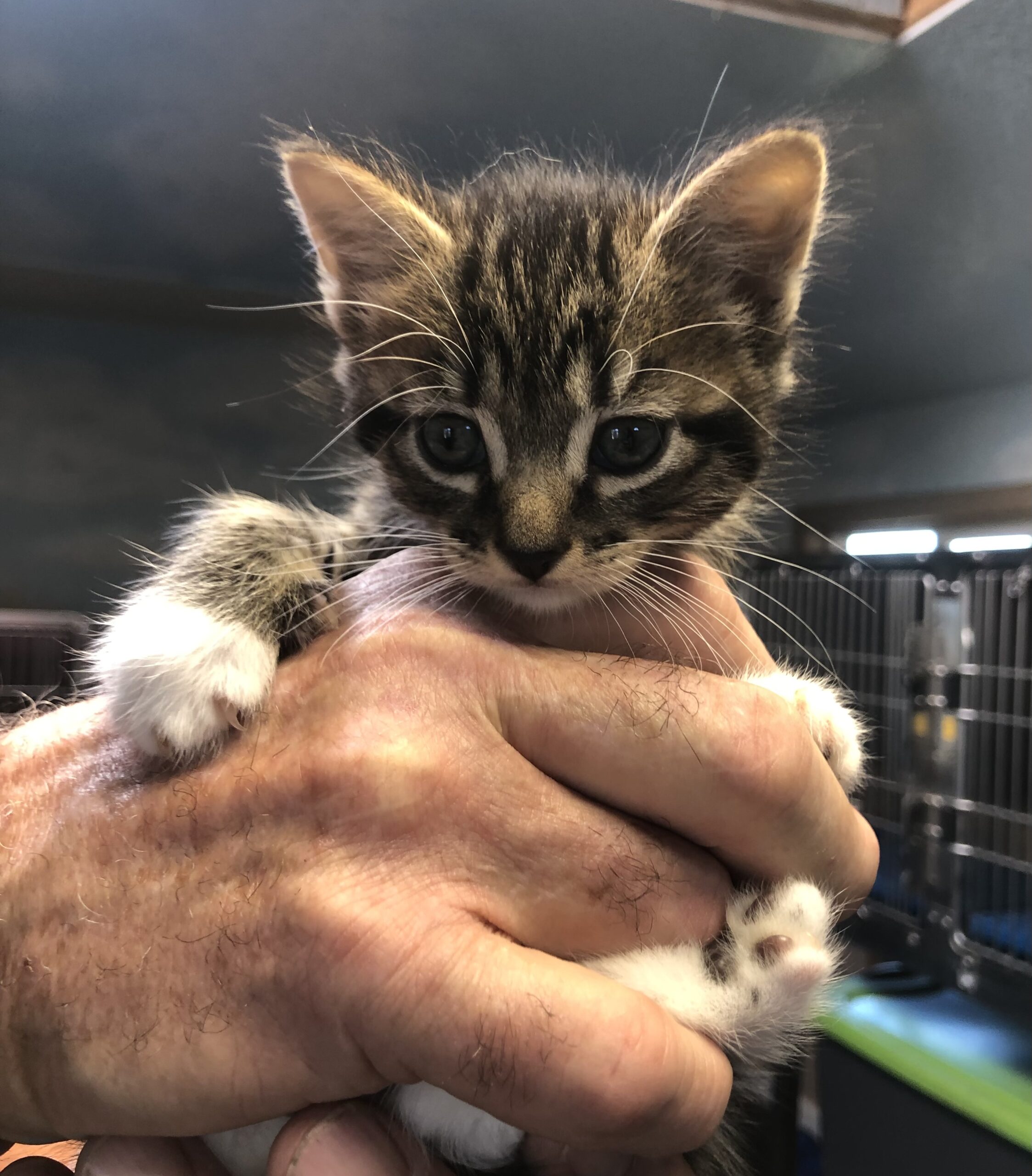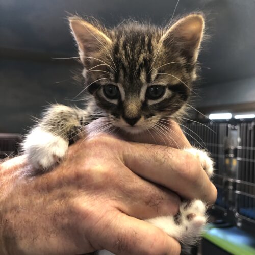 Spock is one of mama Christine's 4 Star Trek baby captains. Spock is a handsome dark gray tabby with white paws. The littermates were raised by mama at Kitty City.
