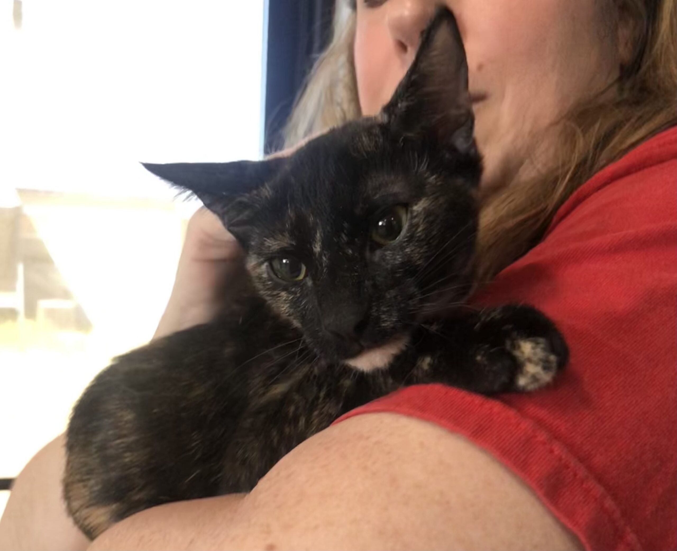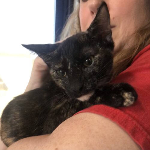Tink is an absolutely adorable little tortoiseshell. When picked up and cuddled close, Tink loves the attention and is content to stay in her human's arms for as long as they want to hold her. She's a gentle and lovable sweetheart.