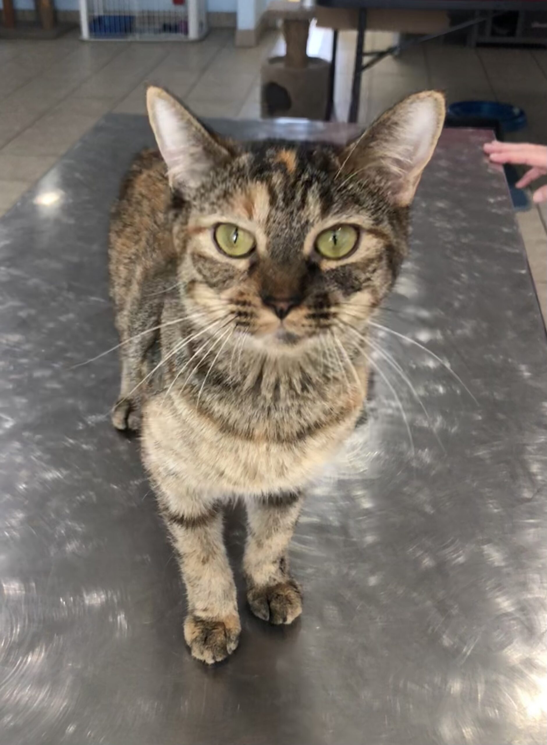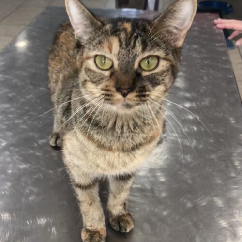 This sweet torbie mama just arrived Kitty City on 9/19/25 from Mescalero, New Mexico. Her four kittens, who are fully weaned, came with her. Autumn is a pretty mixture of brown tabby and tortoiseshell. She has a mixture of patterns and colors, just like the leaves of the autumn season. Autumn and all her kittens are beautiful, friendly and affectionate. They have obviously been well cared for. Autumn was taken to Kitty City's local veterinarian on Monday, September 22, for a health assessment. The vet performed surgery to remove a cyst from her left side. She is recovering nicely.