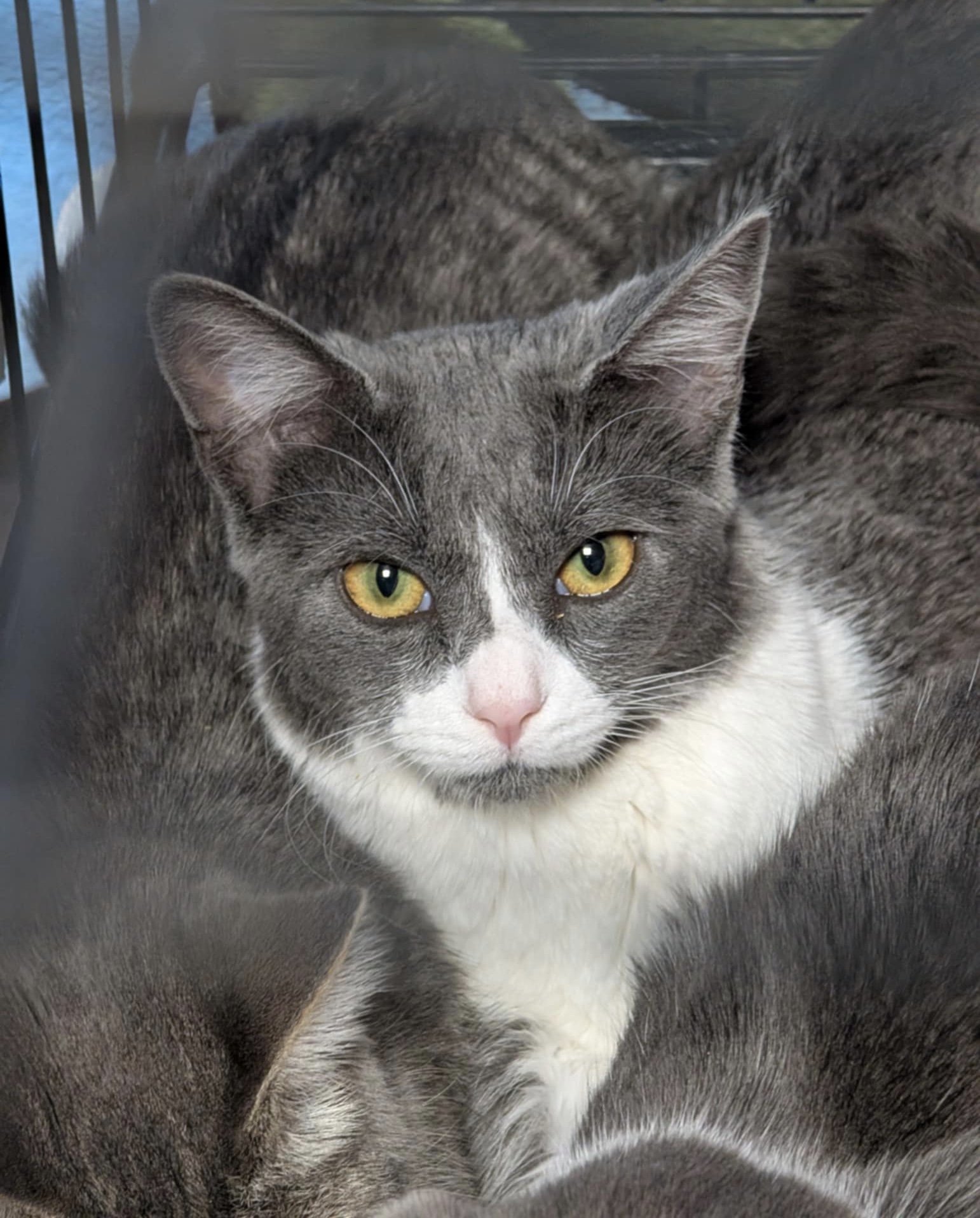 Xena is a friendly kitty. She enjoys being petted, but is a bit uncertain at times about being held. She requires time and patience to become fully comfortable with us.